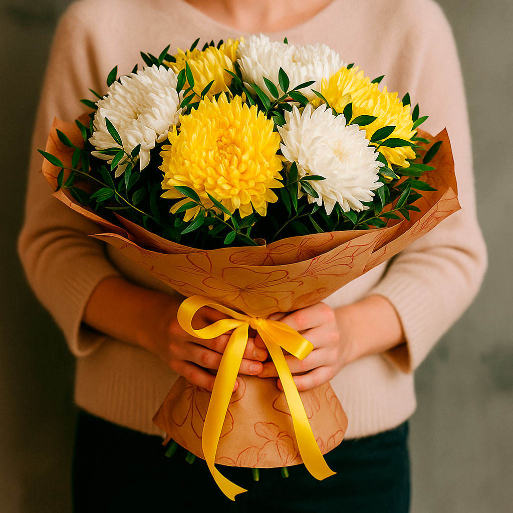 Белые и жёлтые одноголовые хризантемы в сочетании с зеленью создают яркий и свежий образ. Букет перевязан жёлтой атласной лентой и оформлен в крафт-бумагу с рисунком. Возможны альтернативы оформления: матовая плёнка или декоративная сетка. Прекрасный подарок для мамы на день рождения или для коллеги на юбилей.