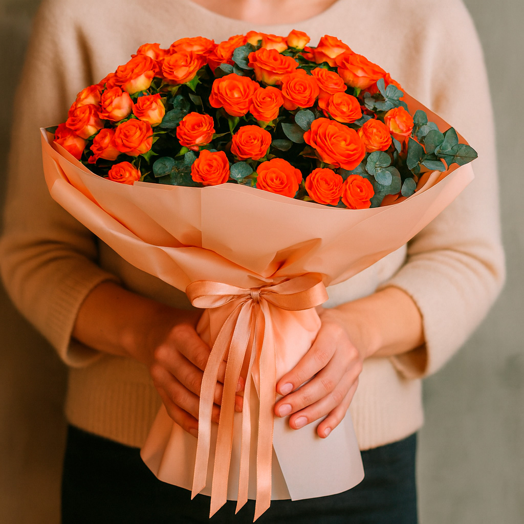 Яркие оранжевые кустовые розы в сочетании с нежным эвкалиптом создают впечатляющий контраст и дарят ощущение тепла. Букет оформлен в матовую плёнку и перевязан атласной лентой, что подчёркивает его элегантность. Альтернативно можно использовать крафт-бумагу или декоративную сетку. Прекрасный выбор для подарка на день рождения для любимой.