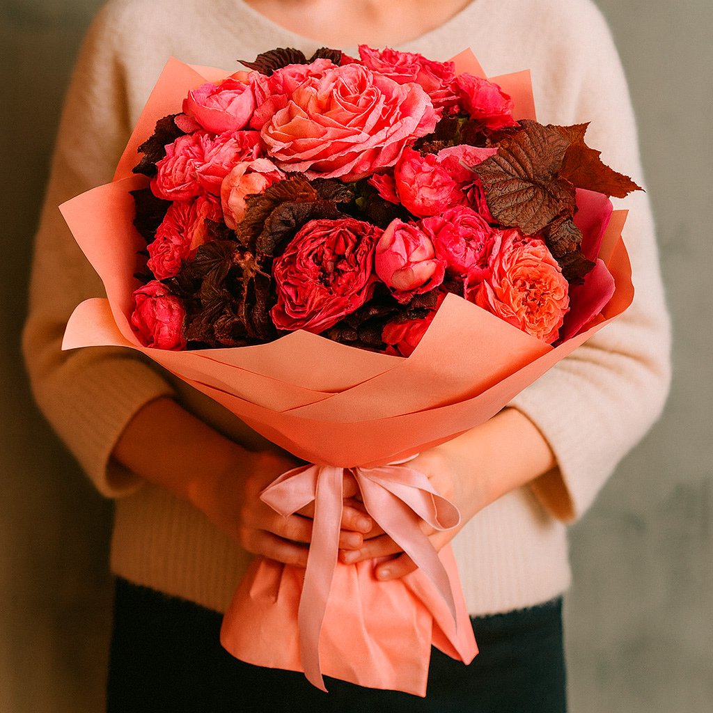 Яркие пионовидные розы в красных и розовых тонах создают атмосферу утреннего рассвета, дополненные свежей зеленью. Букет оформлен в матовую плёнку нежного оттенка и перевязан атласной лентой. Возможна упаковка в крафт-бумагу или декоративную сетку. Прекрасный подарок для любимой на годовщину или день рождения.