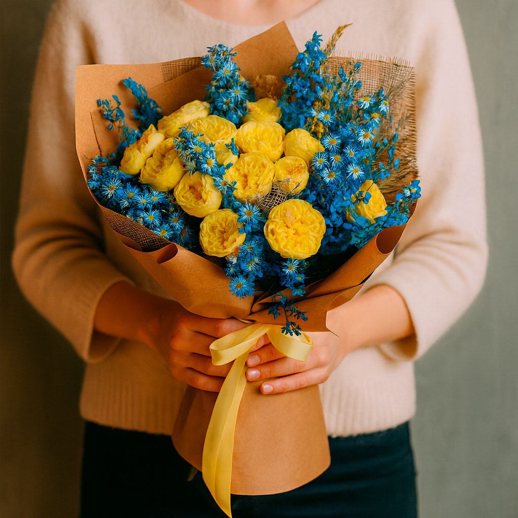 Яркие жёлтые пионовидные розы в сочетании с голубыми ромашками и лунарией создают свежий и воздушный образ. Букет перевязан нежной жёлтой лентой и оформлен в крафт-бумагу, что подчёркивает его естественную красоту. Альтернативные варианты упаковки: матовая плёнка или декоративная сетка. Прекрасный выбор для поздравления на день рождения или для любимой.