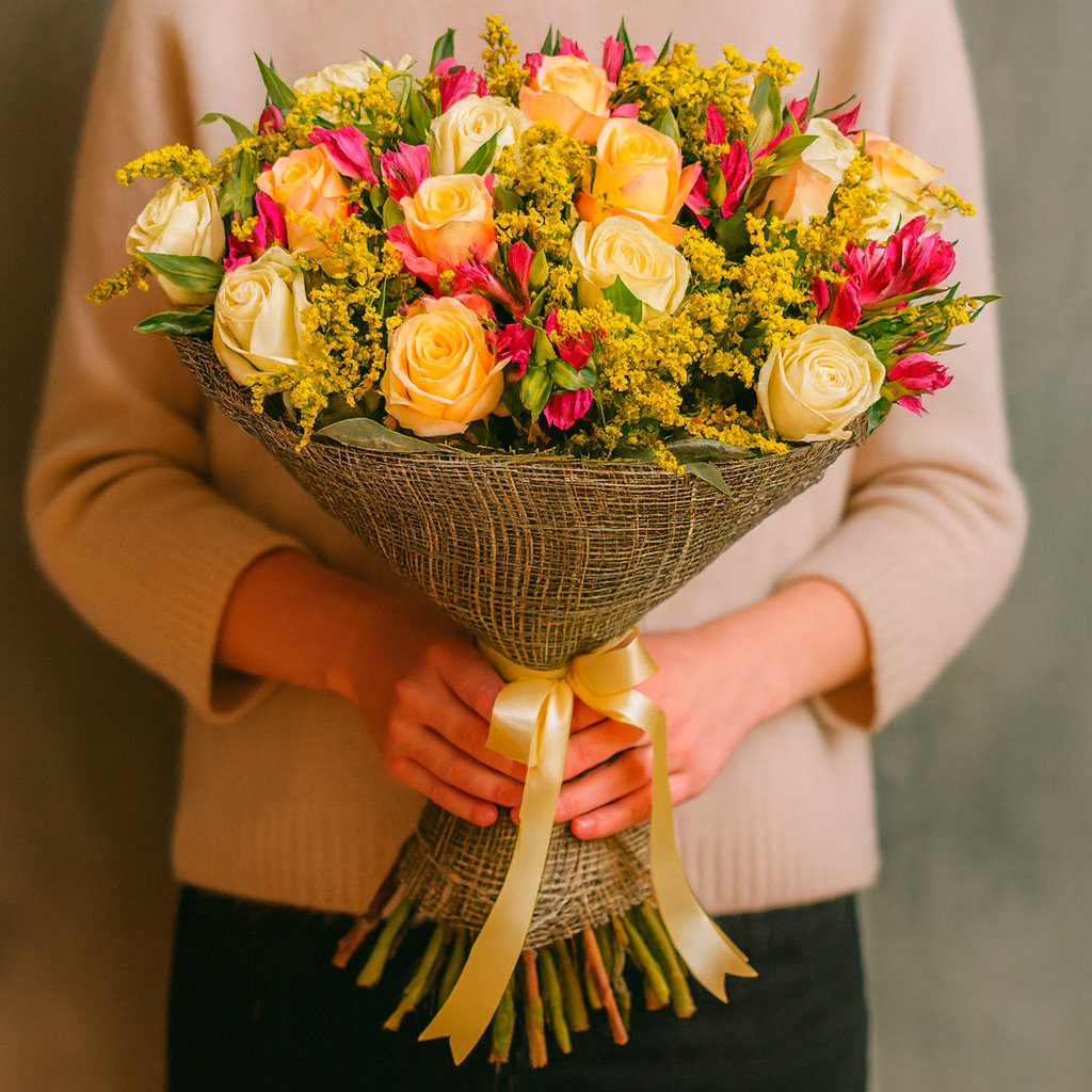 Яркие жёлтые розы в сочетании с розовыми альстромериями и солнечным солидаго создают атмосферу радости и тепла. Букет перевязан жёлтой лентой и обёрнут в матовую плёнку. Возможны альтернативы оформления: атласная лента или крафт-бумага. Прекрасный выбор для подарка на день рождения для любимой.