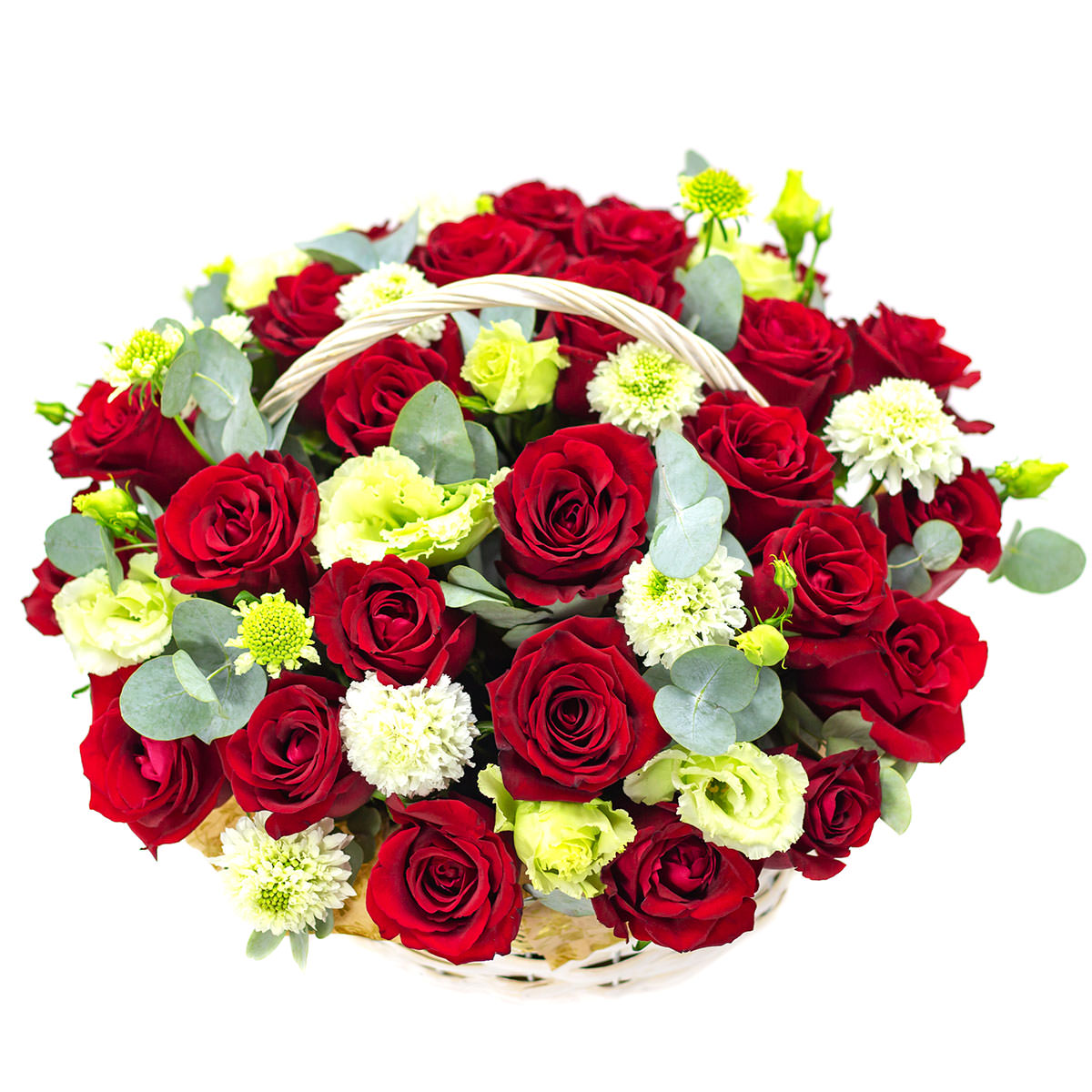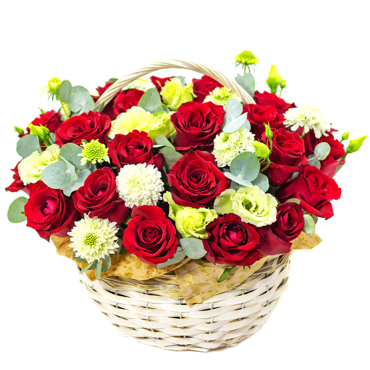 Яркая композиция из красных одноголовых роз, белых кустовых хризантем и жёлтых эустом, дополненная свежестью эвкалипта. Все цветы аккуратно размещены в плетёной корзине, создавая атмосферу весеннего праздника. Возможны альтернативы оформления: корзина из лозы или с тканевой отделкой. Прекрасный подарок для любимой на 8 марта или годовщину.