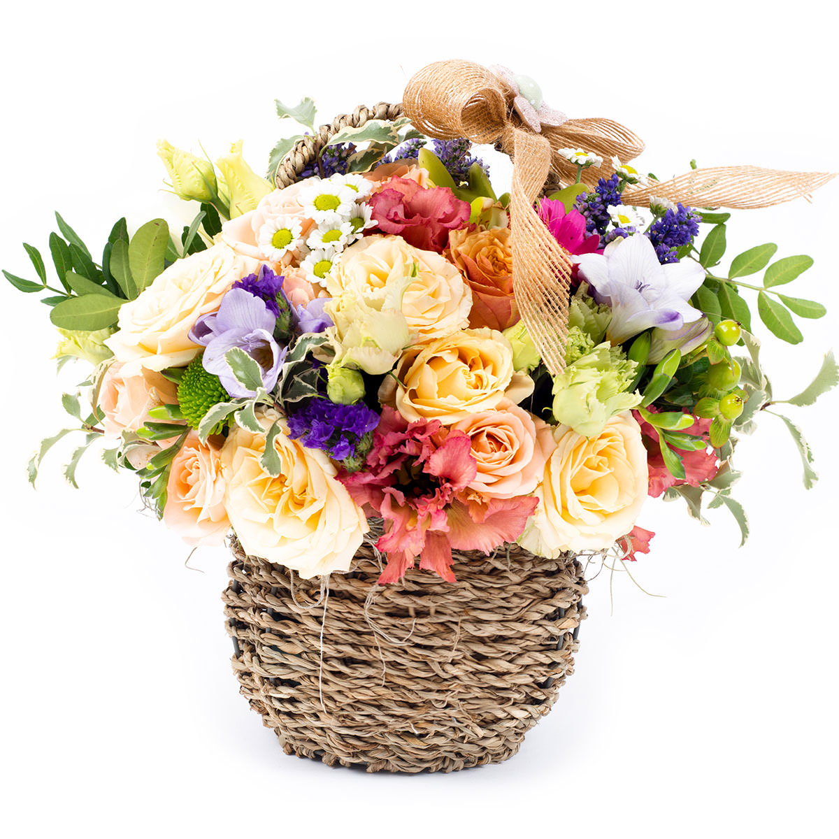 Эта корзина с цветами включает в себя чайные розы, фиолетовые фрезии, красные эустомы, зелёные кустовые хризантемы, гиперикум и статицу. Плетёная корзина с изящной лентой придаёт композиции особый шарм. Альтернативные варианты оформления: корзина из ротанга или с тканевой отделкой. Прекрасный подарок для любимой на годовщину или юбилей.