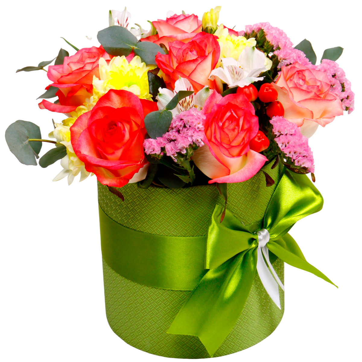 Коралловые розы, желтые кустовые хризантемы, белые альстромерии и розовая статица создают яркую и запоминающуюся композицию. Шляпная коробка зеленого цвета украшена атласной лентой, придающей элегантность. Возможны альтернативы оформления: бархатная коробка или коробка с принтом. Прекрасный подарок для любимой на день рождения или 8 марта.
