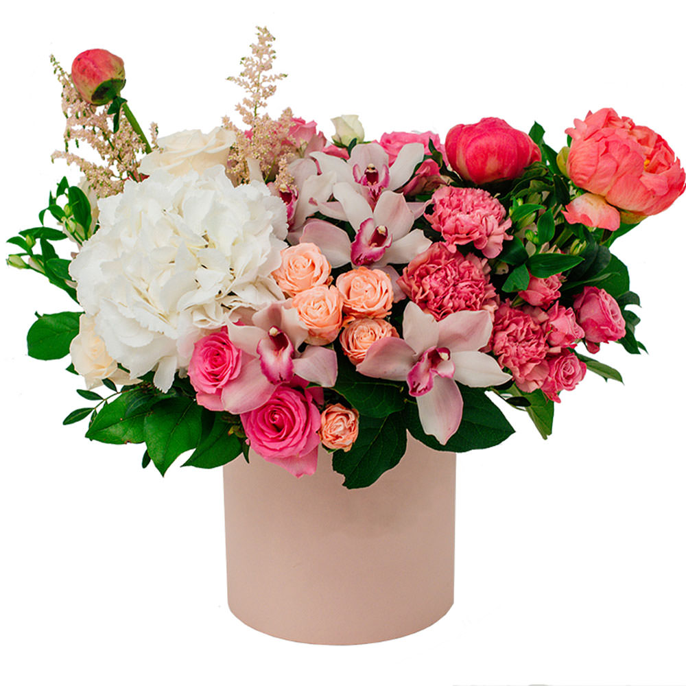 Эта изысканная композиция сочетает в себе белую гортензию, розовые кустовые и одноголовые розы, коралловые пионы, розовые орхидеи и гвоздики, а также эулалию. Цветы аккуратно размещены в элегантной шляпной коробке нежного розового оттенка. Возможны альтернативы оформления: бархатная или дизайнерская коробка. Прекрасный подарок для любимой на день рождения или на 8 марта.